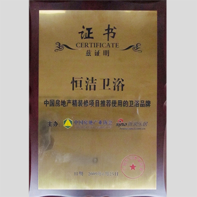 奖 项:中国房地产精装修项目推荐使用的卫浴品牌