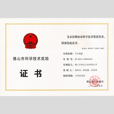 奖 项:2016年度佛山市科学技术奖 专利优秀奖(获奖专利:节水便器)