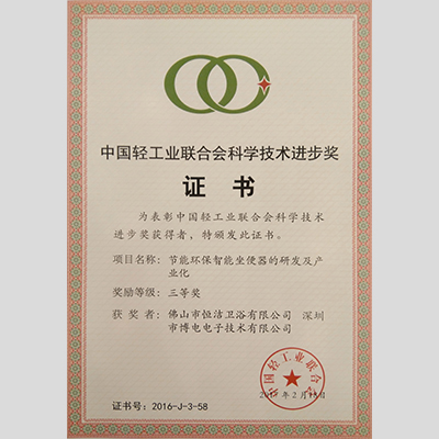 奖 项:中国轻工业联合会科学技术进步奖(项目名称:节能环保智能坐便器的研发及产业化)