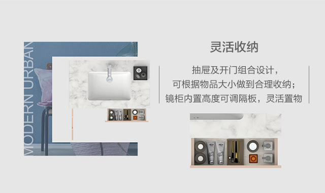 抽屉及开门组合设计,可根据物品大小做到合理收纳;镜柜内置高度可调隔板,灵活置物